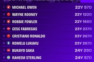 体育资讯10月5日讯 英超第7轮比赛,萨卡点射破门,帮助阿森纳主场2-0击败西汉姆,萨卡成为达成英超参与100球第7年轻的球员。