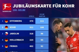 德甲历史黄牌数量排名:埃芬博格111黄居首,D-科尔100黄次席