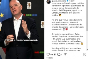 国际足联主席因凡蒂诺社媒发文:“佛得角迎来历史性时刻!他们首次成功晋级世界杯,获得美加墨世界杯的门票👏”